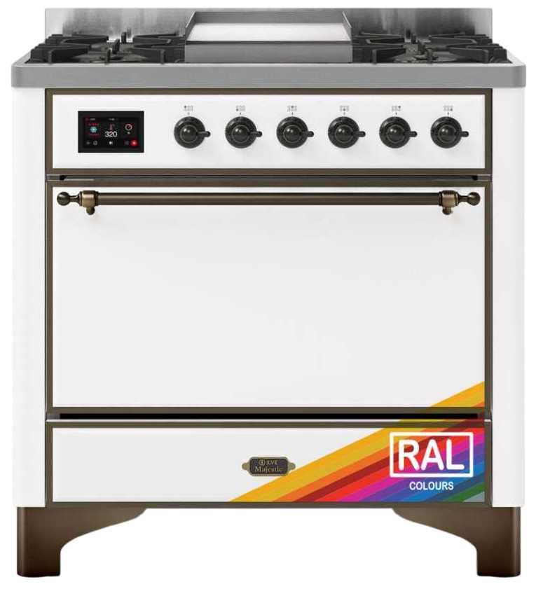 The Majestic 36" dual fuel range combines the classic Italian style and cutting-edge technology. This range features 6 gas burner and griddle, equipped with a total black brass flame spreader with non-stick nanotechnological coating, 3.5 cu. ft. total oven capacity, 4.3" full touch oven control display and easy clean enamel oven cavity.Read More