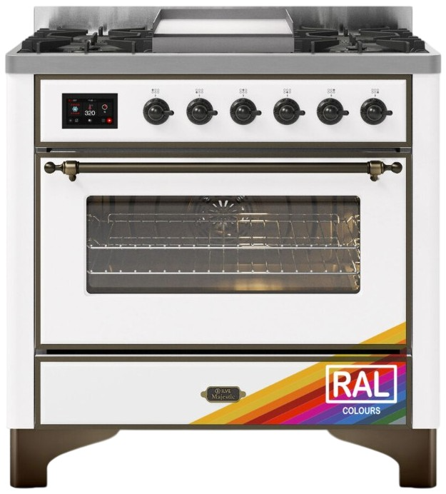 The Majestic 36" dual fuel range combines the classic Italian style and cutting-edge technology. This range features 6 gas burner and griddle, equipped with a total black brass flame spreader with non-stick nanotechnological coating, 3.5 cu. ft. total oven capacity, 4.3" full touch oven control display and easy clean enamel oven cavity.Read More