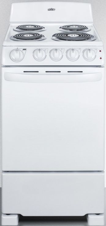 SUMMIT brings outstanding value to small kitchens with fully featured electric ranges in 20" wide fits. Made in North America, the RE203W is a 220V electric range designed for 20" wide spaces. One 8" and three 6" coil burners include removable chrome drip pans for easy cleaning. For added safety, each coil is equipped with a sensor that will automatically cycle the element off if it reaches dangerous flashpoint temperatures. Heating will resume automatically. All cooking controls are located upfront on push-to-turn knobs for safe and easy use. Indicator lights illuminate when the oven is in use. The RE203W features a large 2.3 cu.ft. oven made from durable porcelain, with two adjustable racks and a two-piece broiler pan. The waist-high broiler is conveniently located inside, letting you finish your cooking without transferring contents to an inconvenient drop-down compartment on the floor. The RE203W comes in a white exterior finish with color-matched knobs and handle. With its slim fit and quality design, this unit is the ideal choice for space-challenged kitchens on a budget. For more options, including smooth-top ranges and 24" wide choices, browse our website. Note: this item replaces the RE201W.