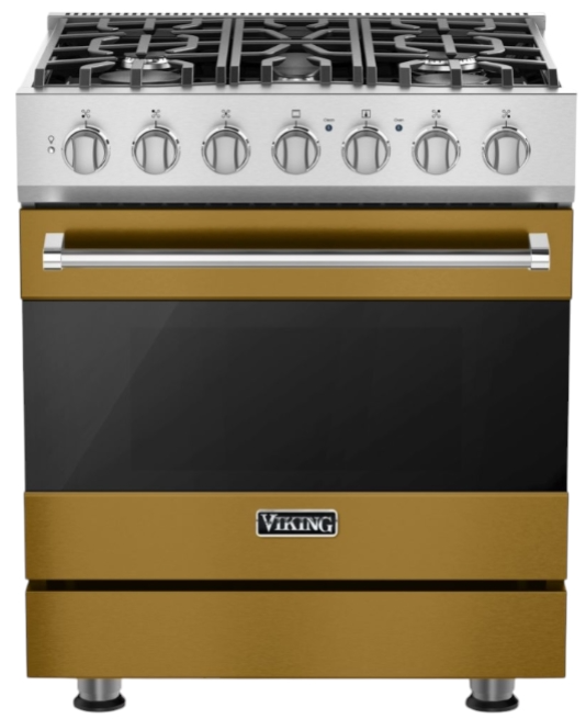 The Viking® Golden Hour 30" Dual Fuel Range features a stunning antique bronze finish and combines gas burners with electric convection. It offers precision cooking and a timeless look, enhancing any kitchen's style.Read More